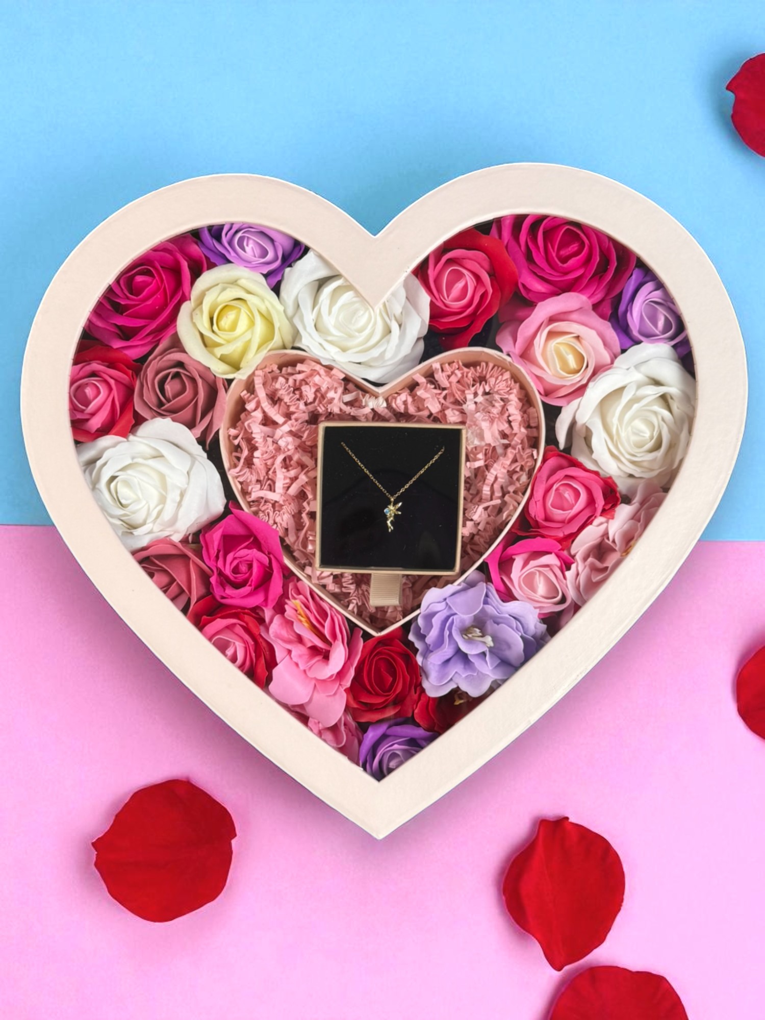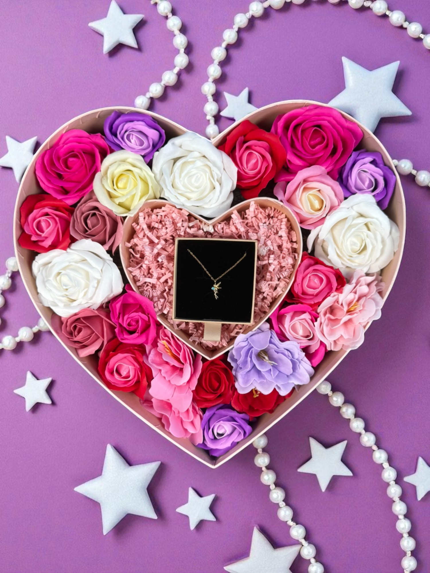 Podaruj bliskiej osobie coś więcej niż zwykły upominek – box prezentowy serce z kwiatami mydlanymi i naszyjnikiem srebrnym to prezent pełen emocji i elegancji. Doskonały dla każdej kobiety, która ceni piękno, subtelność i wyjątkowe gesty.