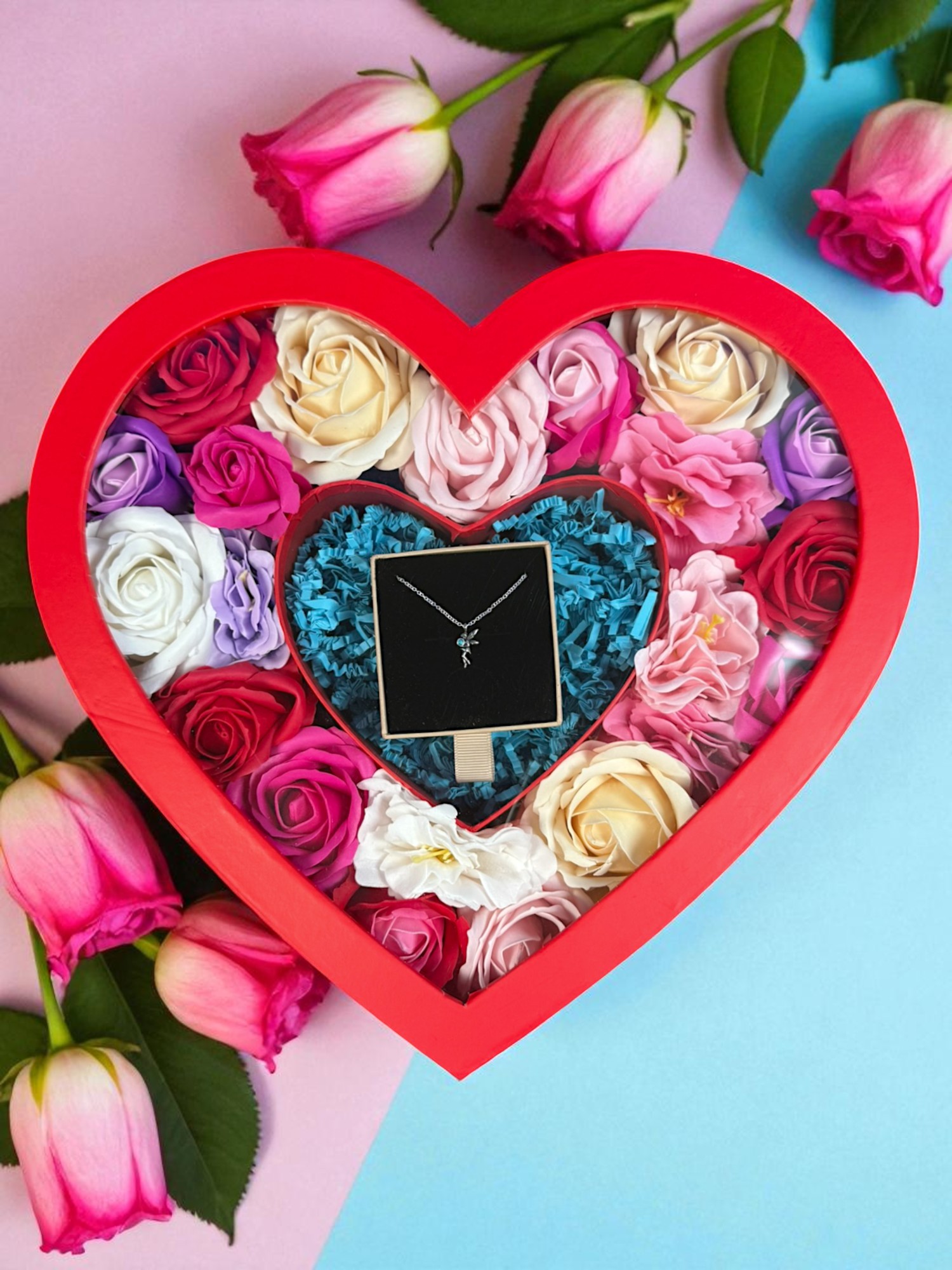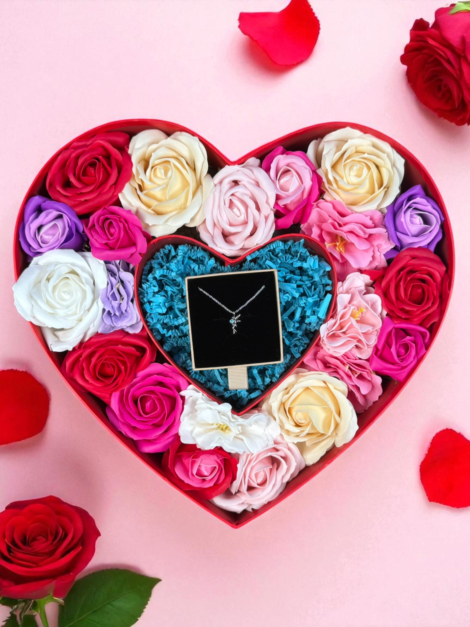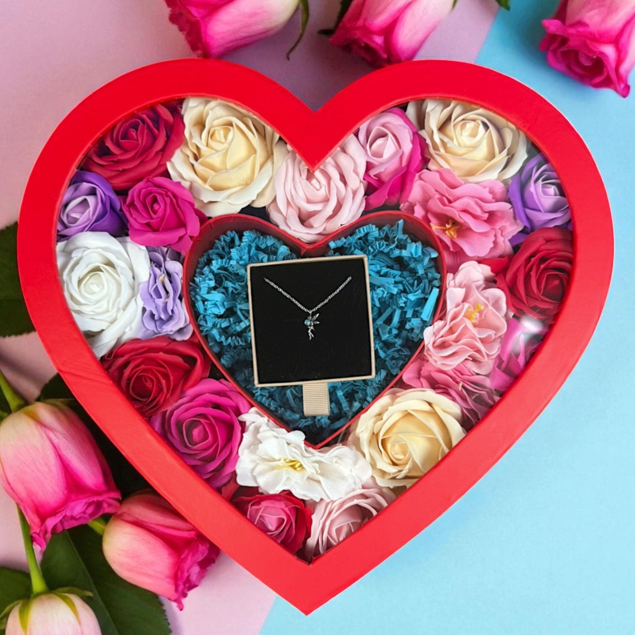 Podaruj bliskiej osobie coś więcej niż zwykły upominek – box prezentowy serce z kwiatami mydlanymi i naszyjnikiem srebrnym to prezent pełen emocji i elegancji. Doskonały dla każdej kobiety, która ceni piękno, subtelność i wyjątkowe gesty.